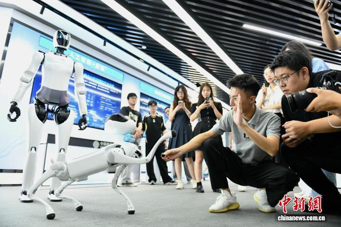 8月6日,在位于济南的中移齐鲁创新院,与会媒体记者与机器狗互动。沙见龙 摄